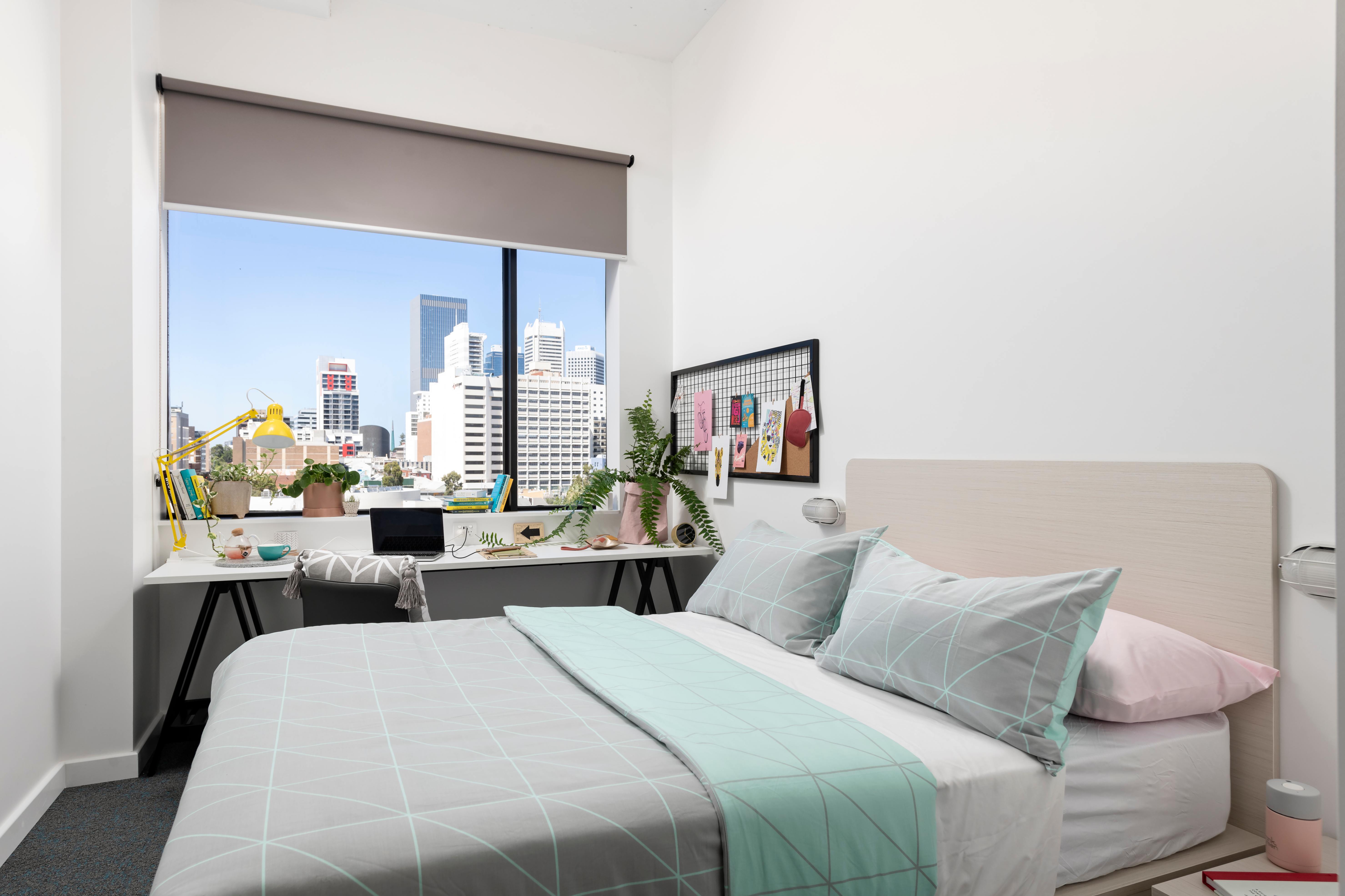 Stop living in a dull and boring student dormitory, come to Campus Perth apartments now! Here you will have your personal space, cool designs, the latest technological facilities, and brand-new furniture. In addition to having your own room, you also have a private bathroom. Did we mention that besides many amazing in-room features, there are also abundant shared facilities? You'll absolutely love everything here! You can study seriously in the study area, refresh yourself on the rooftop terrace, or sweat it out at the fitness center — in short, you'll find everything you need right in the heart of Perth! The apartment complex offers 726 beds and four highly practical room types: Studio (single room), Twodios (double room), Cluster (six-person room), and the classic Campus four-person apartment, which accommodates four students with each paying only a small monthly fee. All bedrooms are full of design elements, featuring bedside desks, storage space, personal curtains, and more.